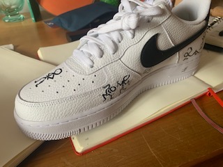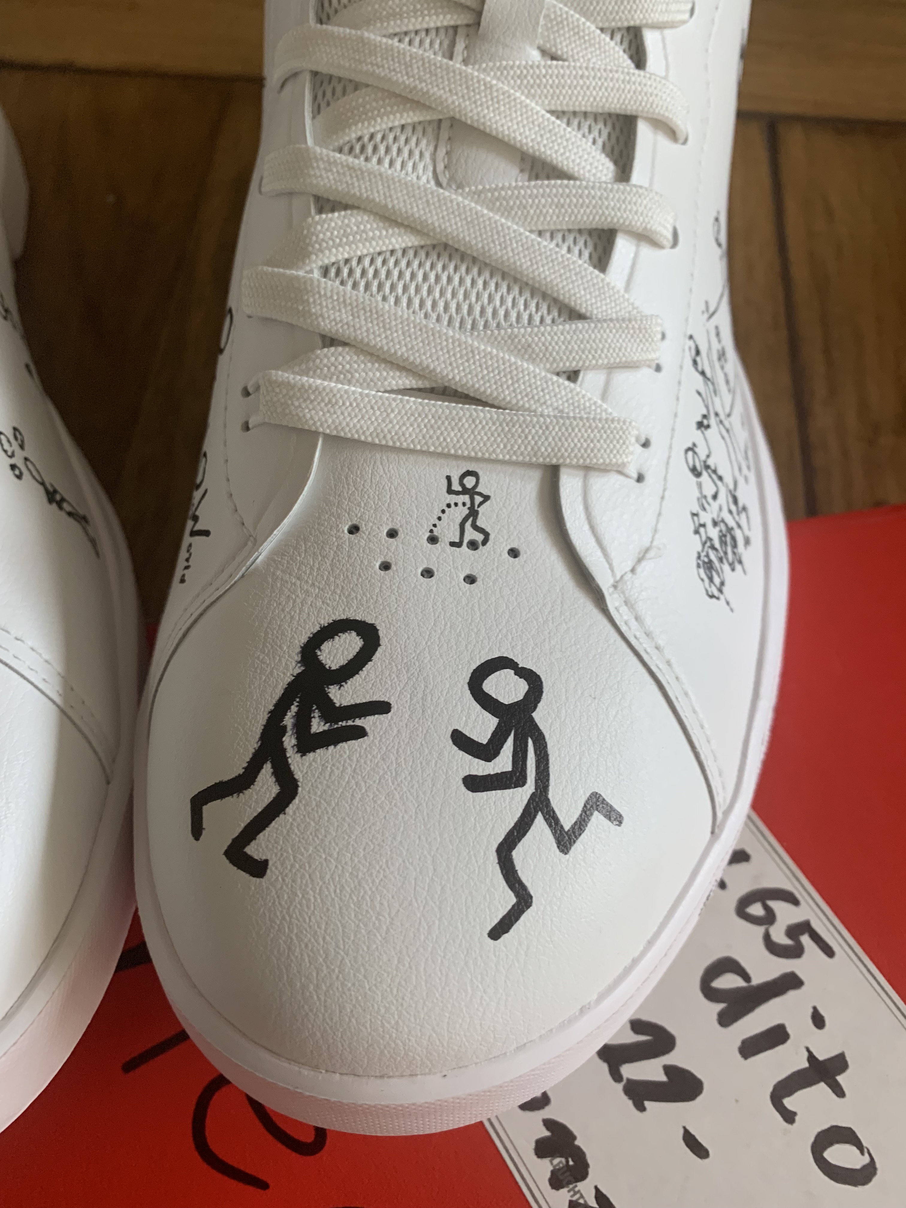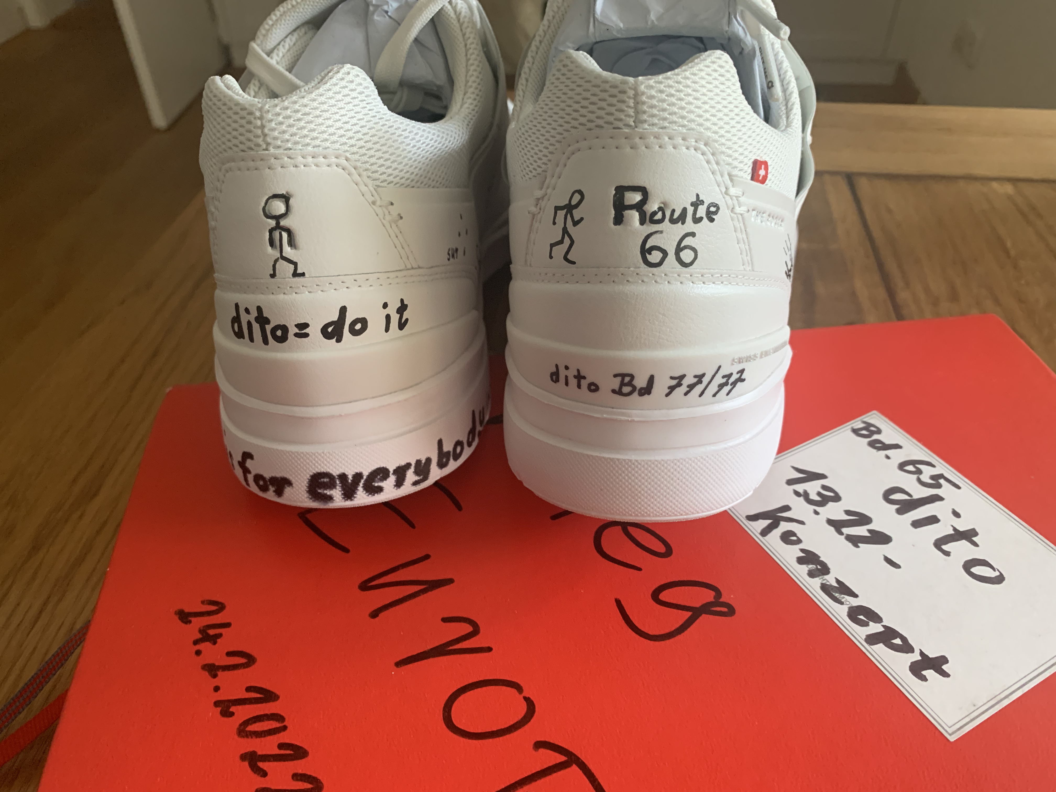 - Die Schuhe werden mit wasserfesten Stiften in der Reihenfolge des Zahlungseingangs (verbindliche Bestellung) gezeichnet und es wird abweichend mit einem Fixativ-Spray abgedeckt.