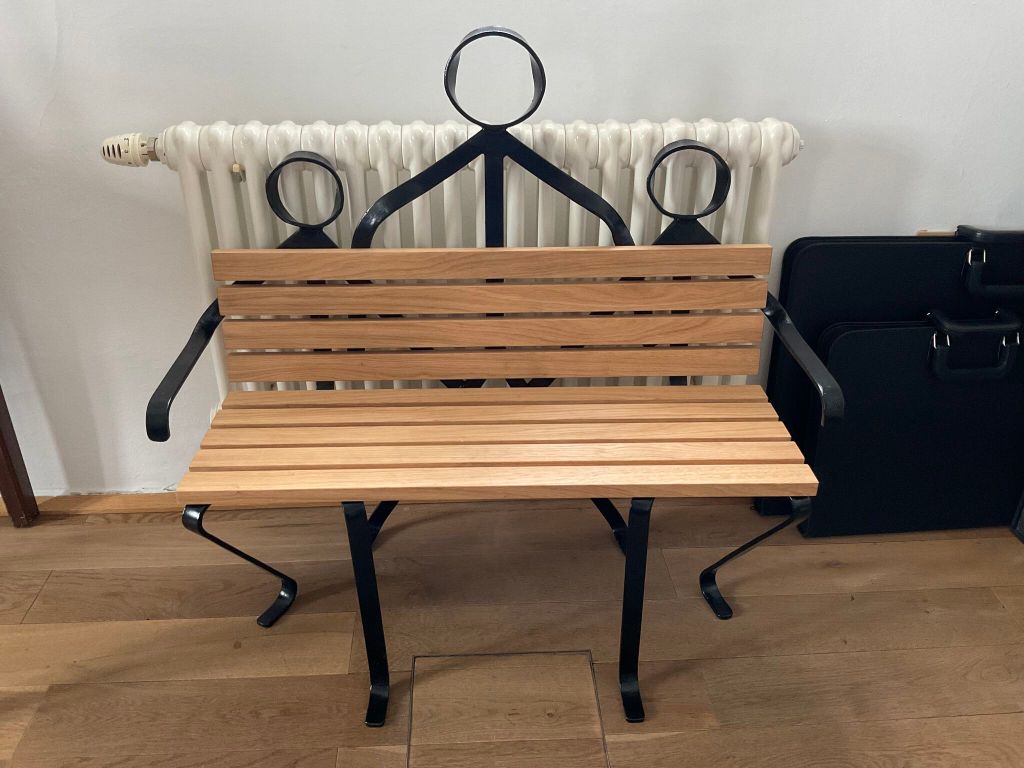 Vorsichtig benutzbare dito-Skulptur aus handgeschmiedetem Flachstahl, schwarz brüniert und Eichenholz. Die dito Bank wird nach individueller Bestellung und Vorkasse in Handarbeit angefertigt.